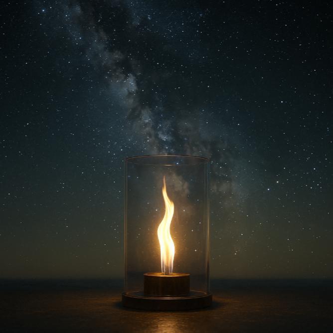 Le luci della camera si abbassarono e la piccola fiamma pulsò all’interno della sua capsula: un tremolio blu-oro, come un battito cardiaco nel buio.